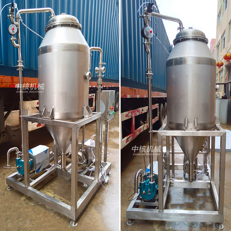 3、開啟視燈,開啟真空泵,待真空度到-0.07~-0.08Mpa左右時,打開進料閥,物料從進料口自吸進入罐內(nèi),當(dāng)物料升至一定位置時(在視鏡處可以觀看到),開啟出料泵出料。